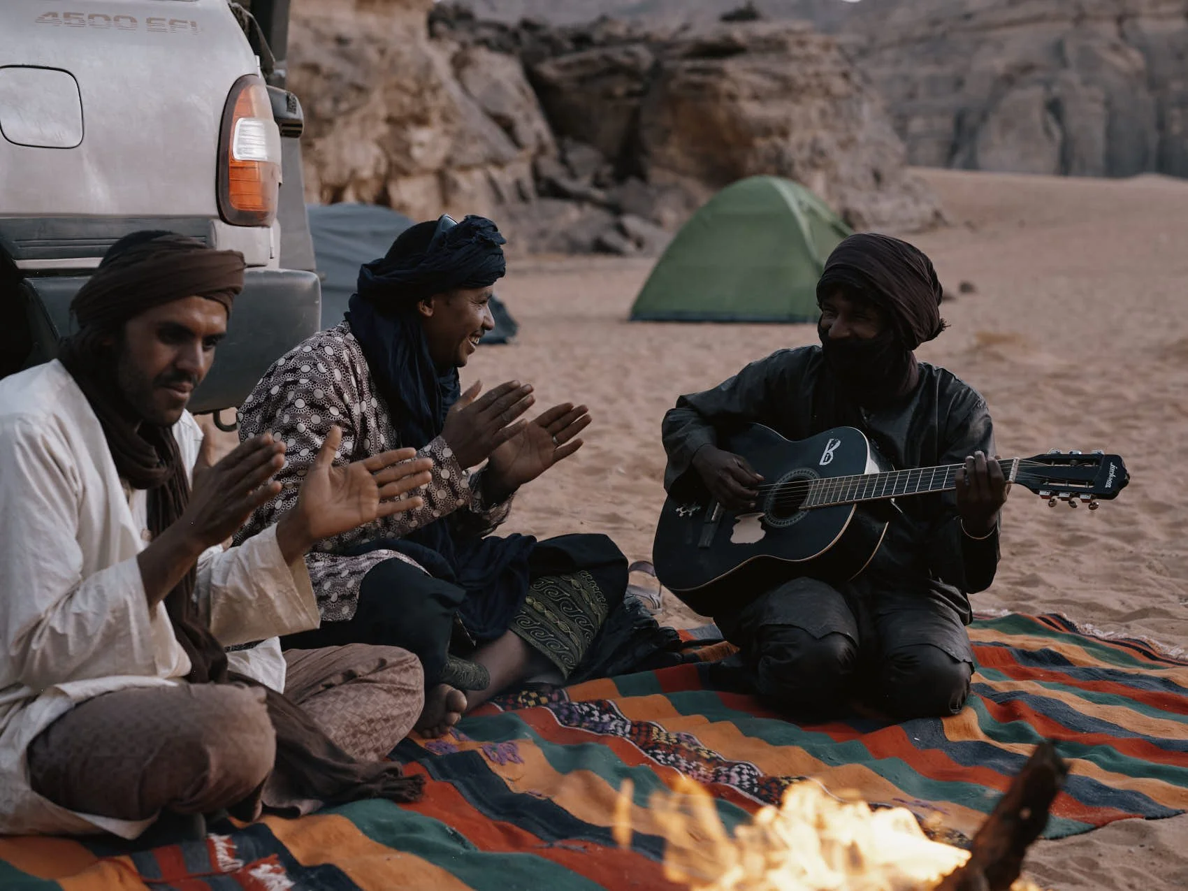 Camp Life: Our tents were put up every night, extra blankets were provided, and we were entertained with desert blues around the fire under a sky thick with stars.